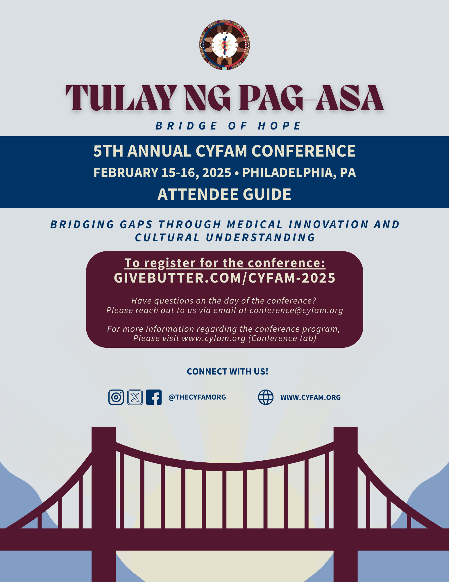 On behalf of the Council of Young Filipinx Americans in Medicine (CYFAM), it is our honor and privilege to welcome you to our 5th Annual Conference, a milestone that marks both a remarkable journey and an exciting new era. This year’s theme, Tulay Ng Pag-asa (Bridge of Hope): Bridging Gaps Through Medical Innovation and Cultural Understanding, reflects our collective journey—one of resilience, sacrifice, and the pursuit of a stronger foundation for future generations. We carry forward our shared stories, building bridges that connect us, our heritage, and the future of medicine.